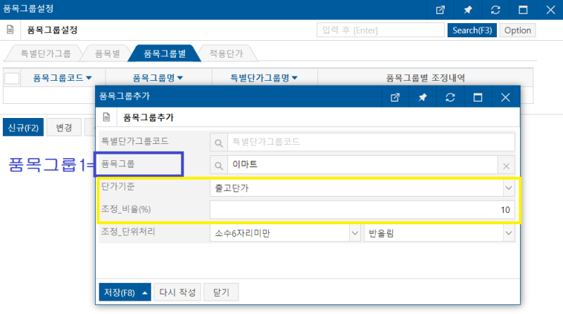 품목그룹1에 속하는 그룹을 선택하고 단가기준과 조정비율을 입력하면 설정한 거래처와 품목그룹에 대하여 특별단가가 설정됩니다. 예를 들어 사진과 같이 조정비율을 10%로 설정했다면 그룹에 속하는 모든 품목이 10% 적용되어 판매입력 작성시 출고단가로 자동 입력됩니다.