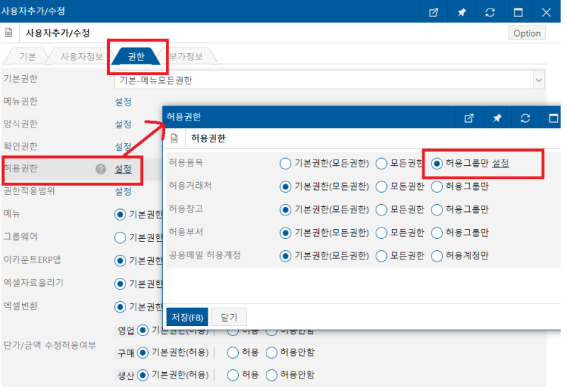 수정할 수 있는 창이 하나 나타나면 [권한] 탭에서 혀용권한 설정을 클릭하고, 허용그룹만 설정을 클릭하면 위에서 보았던 품목계층그룹을 선택할 수 있도록 동일한 창이 나타납니다.