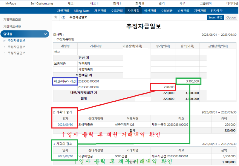 ✔ 추정자금일보에서는 회계II 메뉴에 있는 채권관리와 채무관리와도 연결이 되기 때문에 살펴보겠습니다.