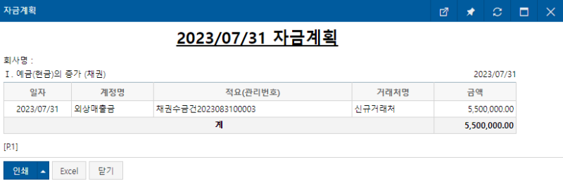 계획전표조회와 출력물(추정자금 일/월/연보)도 확인할 수 있습니다.