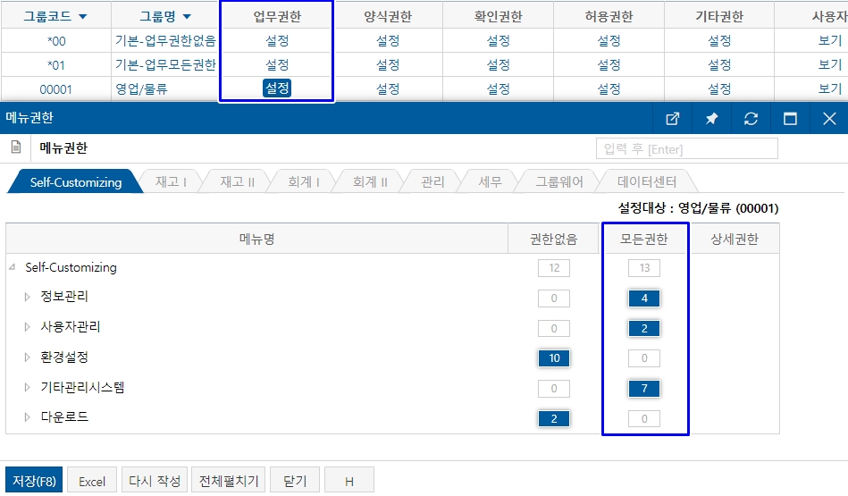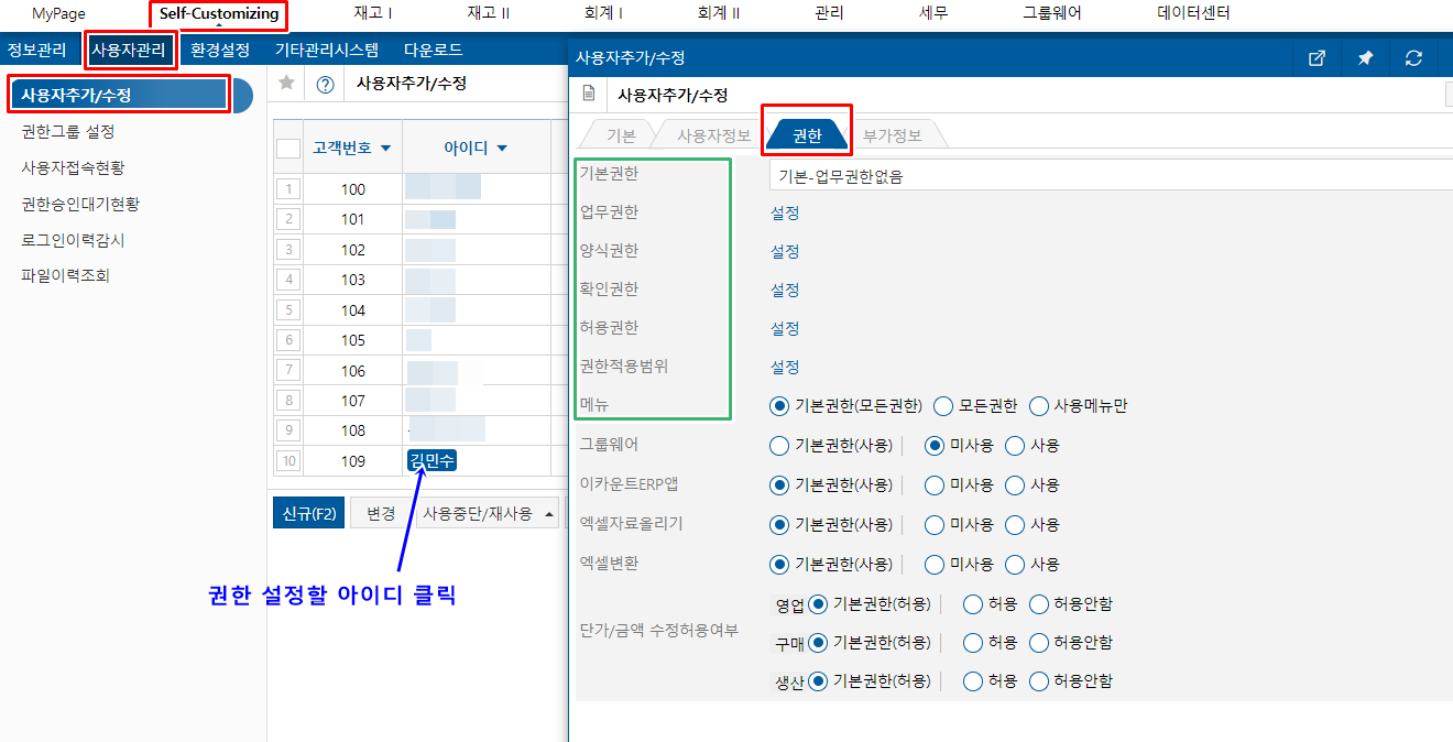 이카운트 ERP : 원하는 대로 메뉴 구성하기(기타권한)