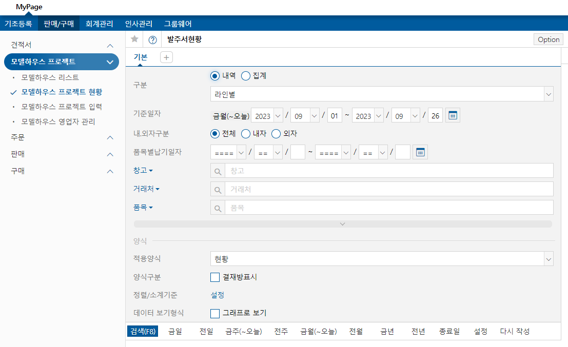 또한 메뉴의 이름 변경도 가능합니다. 예를 들어 우리회사는 이카운트프로그램 메뉴 중 발주서 기능은 사용하지 않고, 발주서 메뉴를 모델하우스 프로젝트를 저장해두는 용도로 바꾸어서 사용한다고 가정해보겠습니다. 이카운트에 '모델하우스 프로젝트'라는 메뉴는 없지만 우리 회사는 이 메뉴를 '모델하우스 프로젝트'라는 이름으로 설정해두고 사용할 수 있습니다.