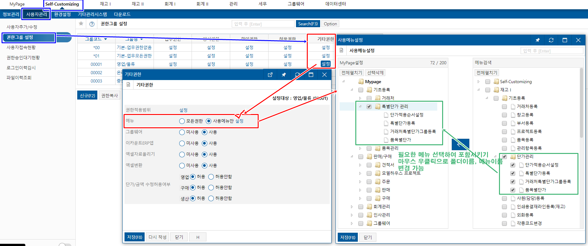 '기타권한'은 특정 그룹에 있는 사용자들 또는 특정사용자를 지정해서 지정한 사용자가 확인 가능한 메뉴를 제한하도록 하는 것입니다.