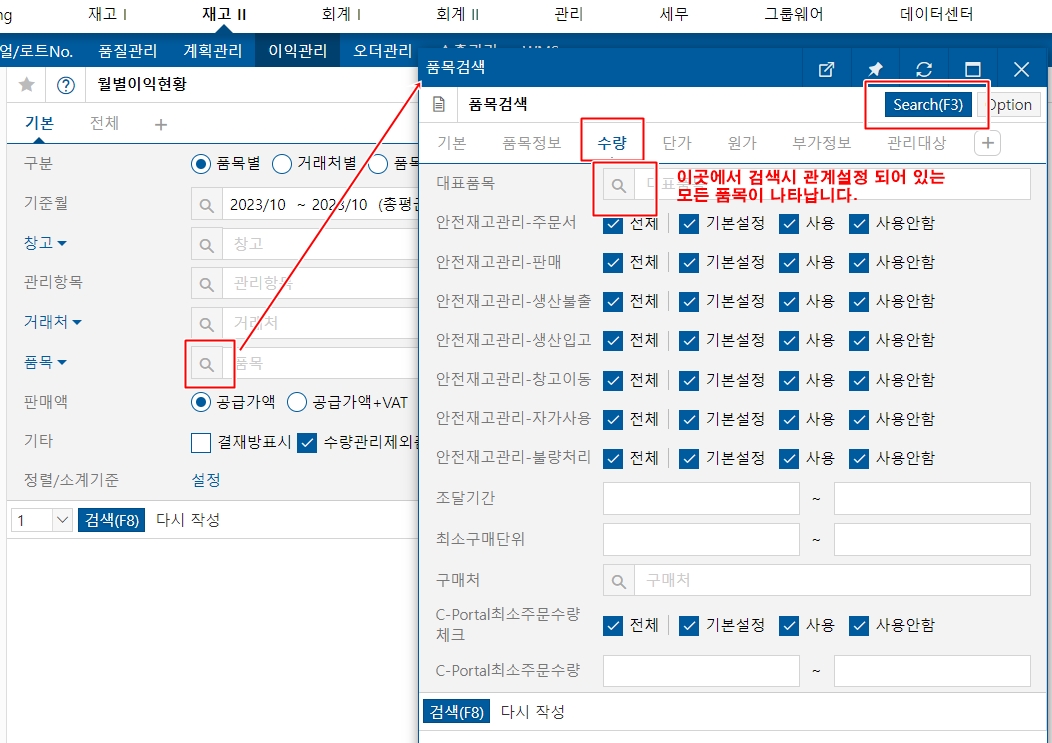 Q10. 관계설정 되어있는 품목이 있는데 이익현황에서 품목을 검색하면 안 나와요.