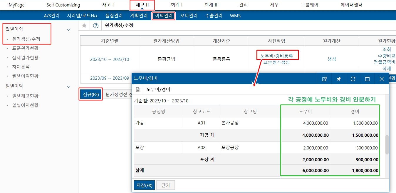 A2. '재고 - 이익관리 - 월별이익 - 원가생성/수정'에서 신규 버튼을 눌러 기간을 설정한 후에 원가 생성을 시작하면 사전작업에서 노무비/경비 등록이 가능한데요. 이 때, 회사에서 정해둔 각 공정에 대한 노무비/경비의 값을 입력해 줍니다. 여기에서 입력한 값은 아래에서 설명드릴 가중치와 계산이 연결됩니다. 결론은 회사가 정한 비율로 안분해 주어야 합니다.