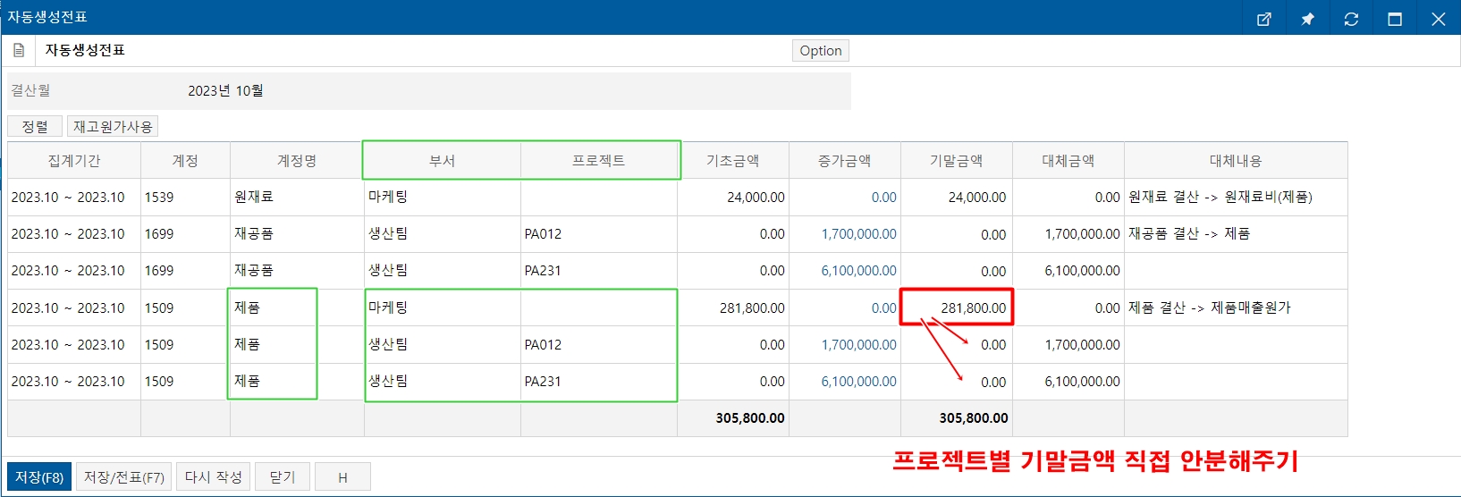 이 때 프로젝트가 없는 행을 공통 프로젝트라고 하는데요, 전표를 생성하면 동일한 계정에 대하여 기말금액은 공통 프로젝트에 합산되어 나타납니다. 이카운트가 자동으로 프로젝트별 금액 안분을 해줄수는 없으므로 프로젝트별 기말금액을 직접 안분해 주어야 합니다.