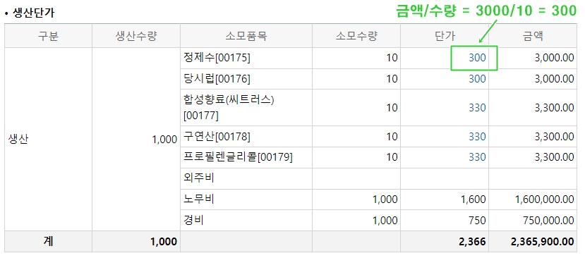 콜라는 원가생성에 들어간 전체 노무비에 20/(20+30)이 곱해지게 되고, 제로콜라는 전체 노무비에 30/(20+30)이 곱한값을 해당 품목의 노무비금액에 반영됩니다. 이 금액에 소모 수량이 나누어져 '노무비 단가'가 계산됩니다.