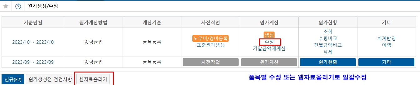 원가계산 생성을 한 이후에 수정 버튼을 눌러 품목별 단가를 입력 해주면 됩니다. 자료가 많을 경우에는 웹자료올리기 기능을 이용할 수 있습니다.