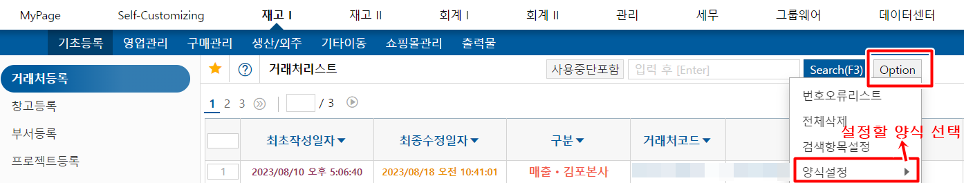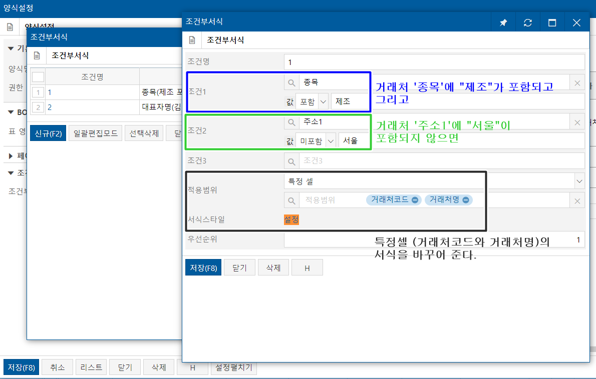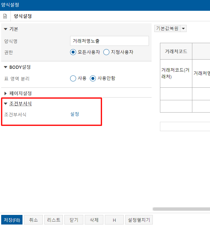 아래 예시는 거래처 리스트의 설정 모습이지만 품목등록, 판매조회 등 양식 설정에서 조건부설정이 가능하다면 모두 동일하게 적용이 가능합니다.