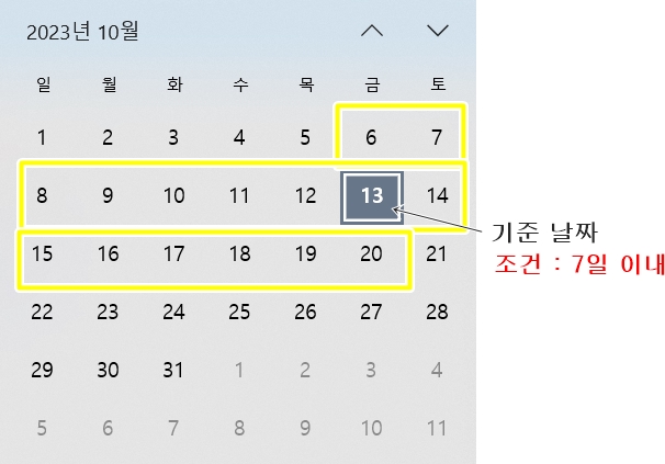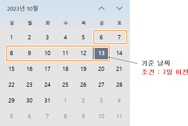 조건 1 : 오늘 포함 7일 이전의 주문일자 음영을 흰색으로