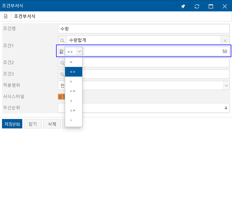만약 '수량'처럼 숫자형식의 내용이라면 조건에 대한 값 구분이 <>=을 선택하는 방식으로 변경됩니다.