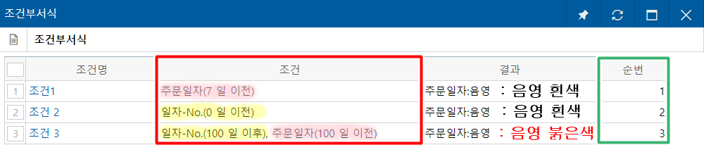 조건 3 : 일자-No. 가 미래 날짜이고, 주문일자가 과거면 주문일자 음영을 붉은색으로