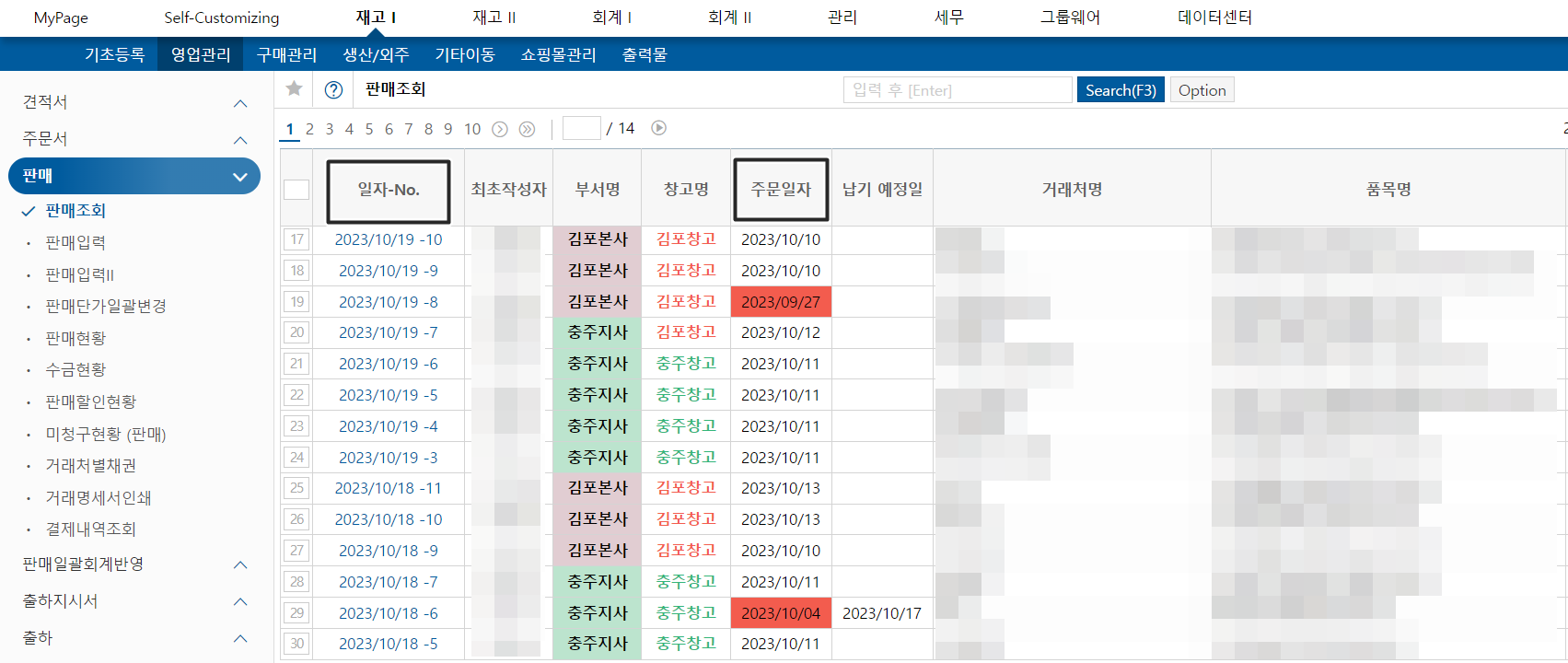 '일자-No.'가 미래 전표이면서 동시에 '주문일자'가 오늘 시점으로 8일 보다 이전이라면 주문일자에 붉은색 음영을 표시해 줍니다.