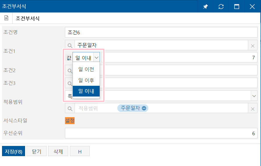 먼저, 조건 항목의 값 구분에 있는 '이전/이내/이후' 구분법부터 알아두시면 이해가 편할 것 같습니다.