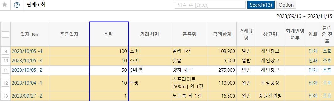 판매조회 화면을 확인해보니 다음과 같습니다.