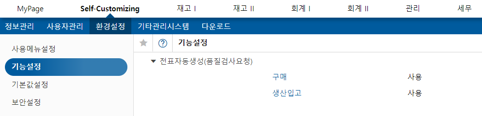 먼저 Self-Customizing - 환경설정 - 기능설정 - 재고 탭 - 전표자동생성(품질검사요청) 에서 사용 처리를 하게되면 구매 또는 생산입고시 품질검사요청 항목이 자동으로 체크되고 전표가 생성됩니다.