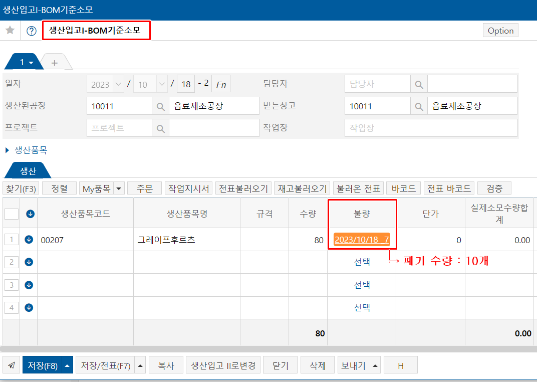 위 화면과 같이 생산수량에 80개, 불량수량을 10개 입력한다면 생산된 재고 수량은 80개 일까요? 70개 일까요?