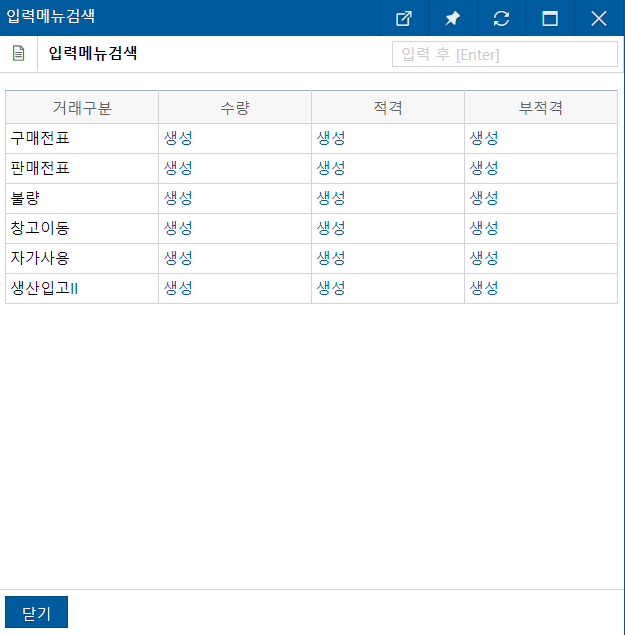 아래 사진은 생산입고Ⅰ화면 입니다.