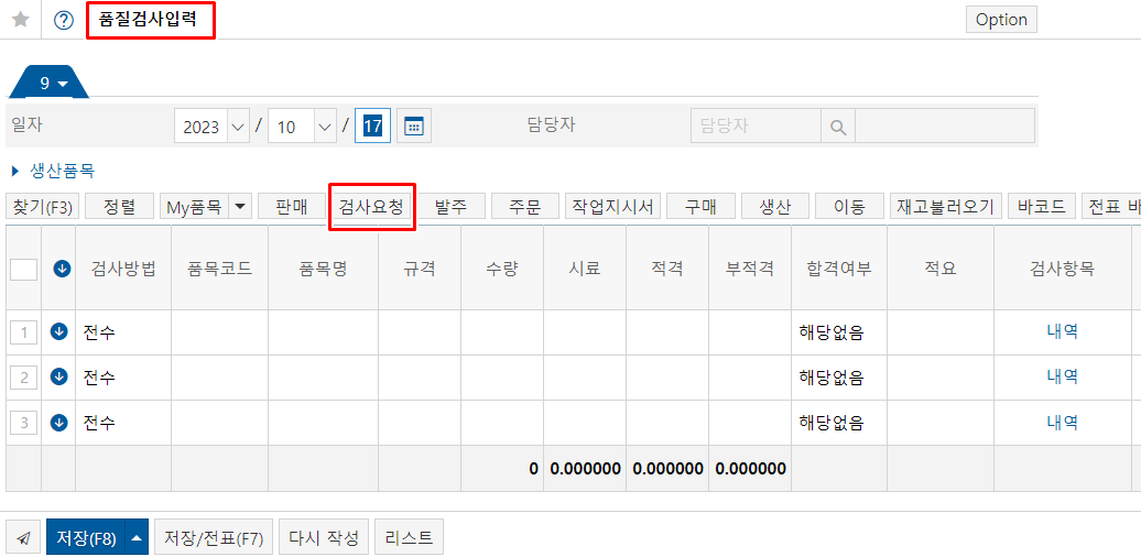 품질검사 유형등록에서 검사항목과 해당하는 품목을 등록한 뒤에 품질검사 요청이 들어왔던 내역을 처리해줍니다.