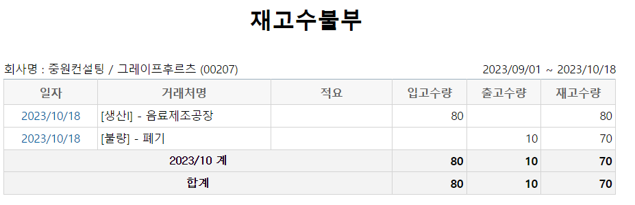 생산이 80개 되었지만 불량으로 인하여 10개 출고 처리되어 최종 재고수량은 70개가 됩니다.