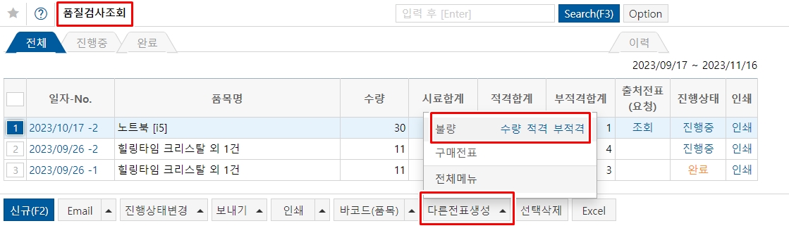 입력을 마쳤다면 위 사진과 같이 품질검사조회 - 다른전표생성 - 불량 - 부적격 을 클릭하여 부적격 수량만을 불량입고 전표로 처리 할 수 있습니다.