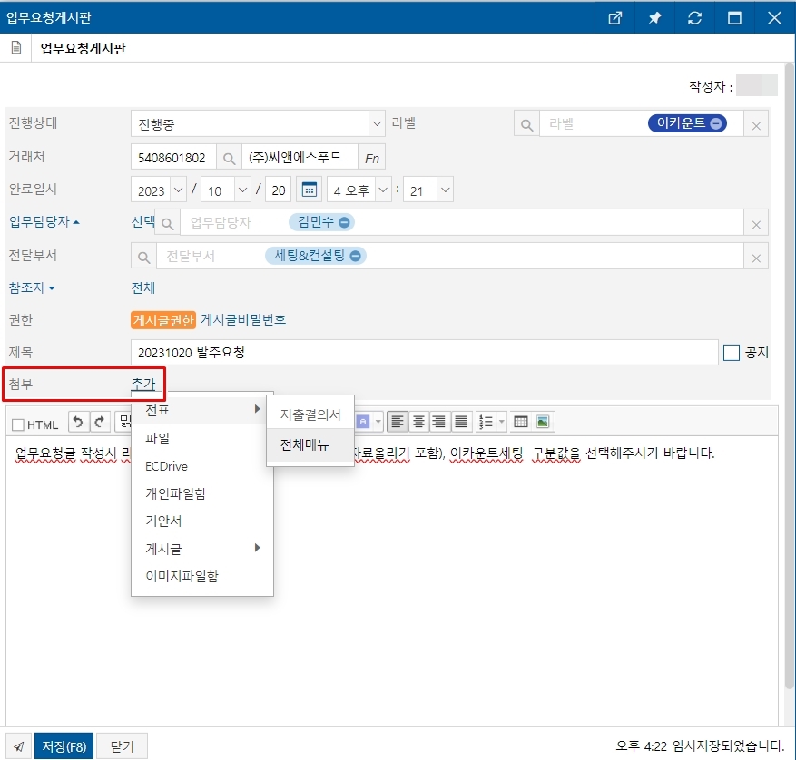또한 게시글 작성시 업무 담당자, 전달부서, 참조자 입력이 가능하므로 게시글을 읽는 사용자가 해당 게시는 어떤 사원의 담당인지 구분 가능합니다.