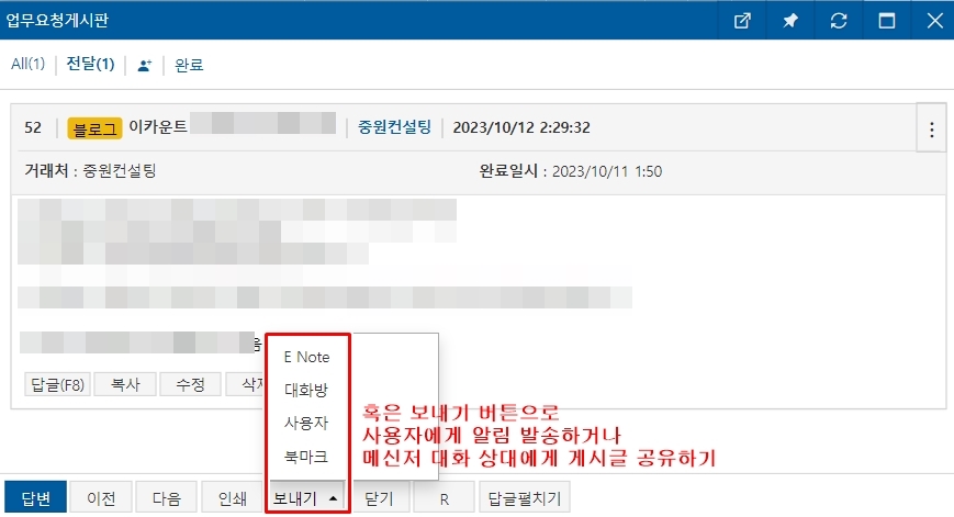 현재 사용하고 있는 업무요청게시판을 예시로 소개해 드리겠습니다.