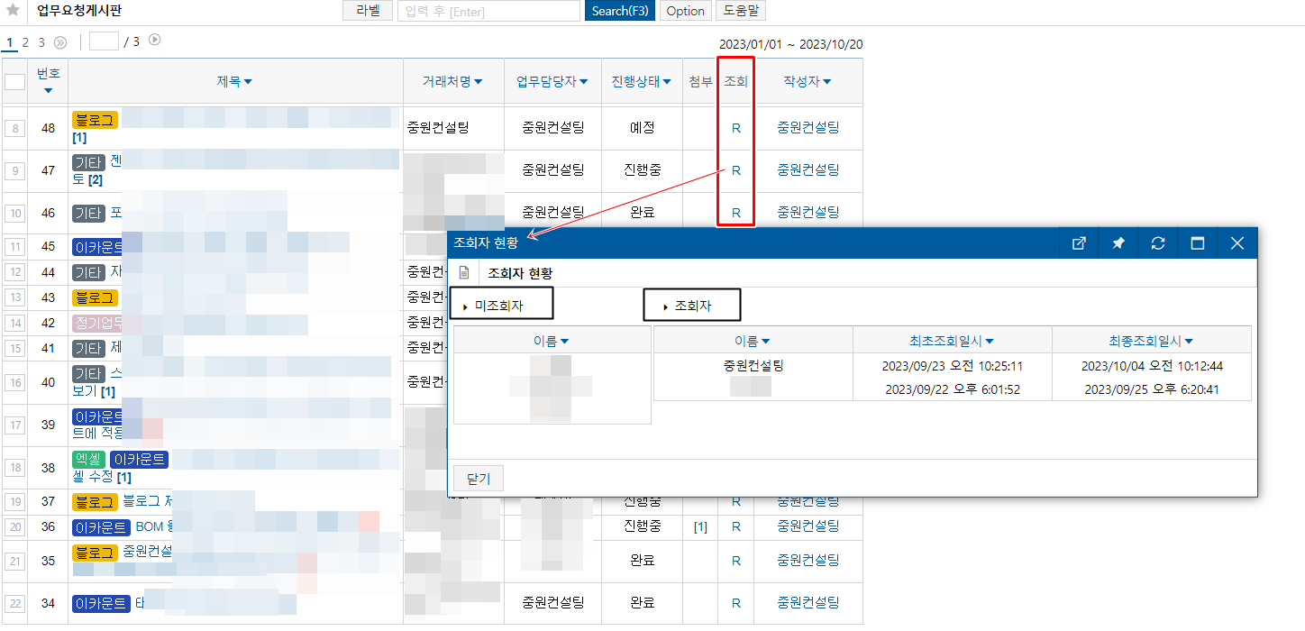 전체 게시판에서 조회열 또는 특정 게시글에서 하단의 R 버튼을 누르면 해당 게시글을 조회·미조회 한 사용자를 확인할 수 있습니다.