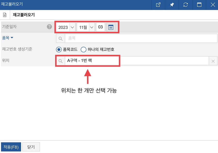 - 품목코드 : 재고조정할 품목을 선택합니다.