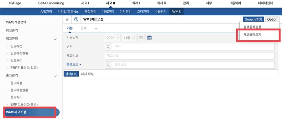 경로 : 재고Ⅱ - WMS - WMS재고조정 - Option - 재고불러오기
