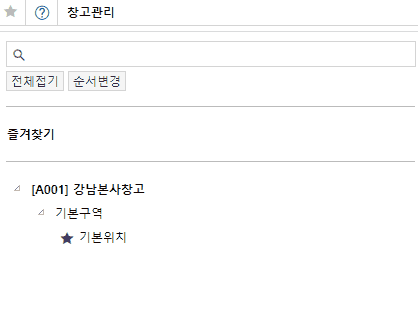 위와 같이 창고관리 메뉴에 진입 시 처음에는 기본구역과 기본위치가 기본값으로 생성이 되어 있습니다.