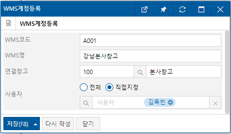 - WMS명 : 임의로 작성(창고명 입력하면 됩니다.)