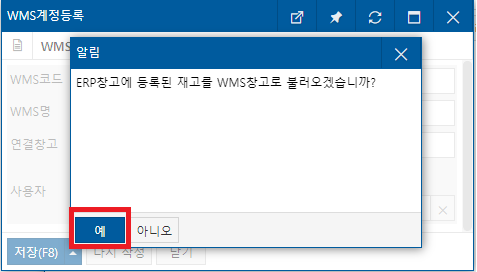 이 때, 예 버튼을 클릭하면 별도의 재고조정 없이 현재 재고Ⅰ- 출력물 - 창고별재고현황 의 데이터를 끌고과 WMS재고조정을 진행하게 됩니다. 저는 재고조정은 따로 설명할 예정이므로 아니오 를 클릭하여 WMS 계정만 등록하겠습니다.