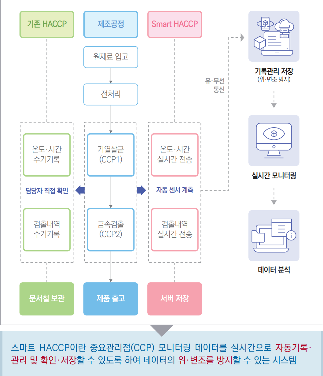 식품제조 공장에 LoT등 기술을 활용, 식품 안전 정보를 디지털화하고, 중요관리점 모니터링을 자동화하는 등 HACCP 관련 데이터 수집·관리·분석을 총망라한 디지털 기반 HACCP 종합관리시스템을 말합니다. 중요관리점(CCP)자동 기록관리 시스템 또한 스마트 HACCP의 한 부분이며, 중요 관리점 자동 기록관리 뿐만 아니라, 선행요건 및 HACCP관리 체계를 모두 디지털로 전환시키는 것도 스마트 HACCP입니다.
