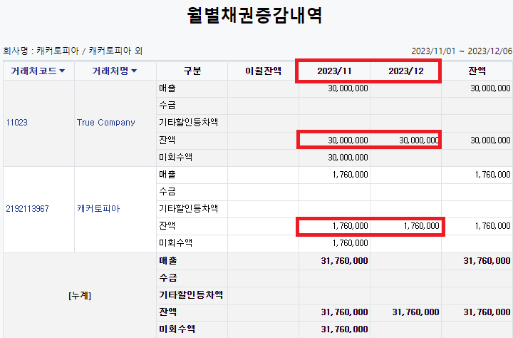 가끔 고객사들 중, 위에서 확인한 거래처별 채권을 월 별로 확인하고싶어 하는 경우가 있습니다. 그래야 채권 잔액 추이를 알 수 있기때문입니다. 이 경우, 월별채권증감내역을 확인하면 간단히 거래처별 > 월별로 매출/수금/잔액을 확인할 수 있습니다.