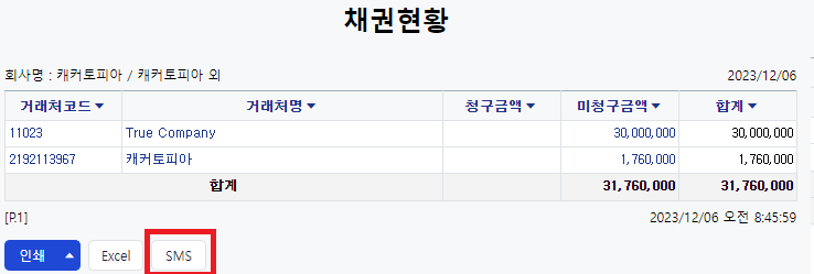 또한, 이 장부에서는 특별한 기능이 제공됩니다. 아래 캡쳐화면에서 빨갛게 표시한 SMS 버튼입니다. 이 버튼을 클릭하면 현재 채권잔액이 있는 리스트의 업체들에게 한꺼번에 미수금 요청할 수 있는 문자를 발송 할 수 있습니다.