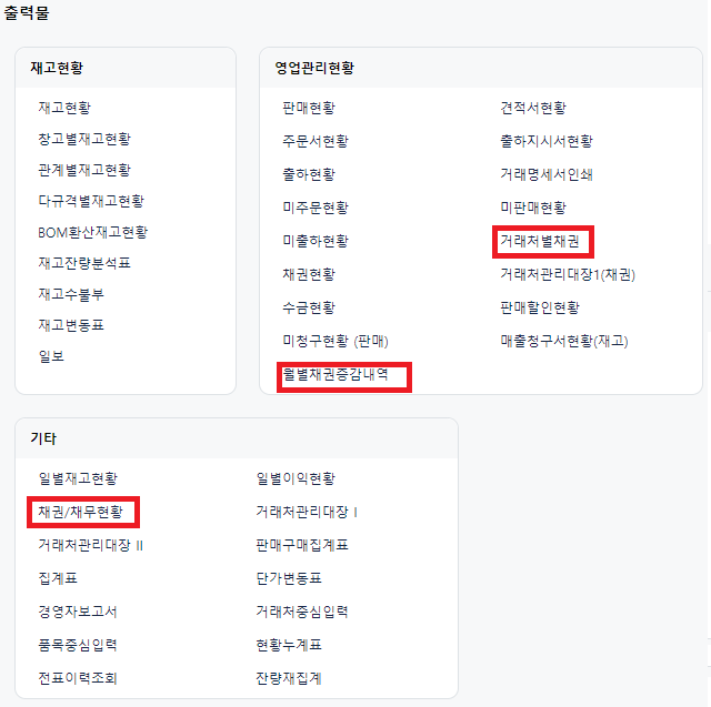 위 경로로 들어오면 아래와 같이 채권관련 세 개 출력물이 있습니다.