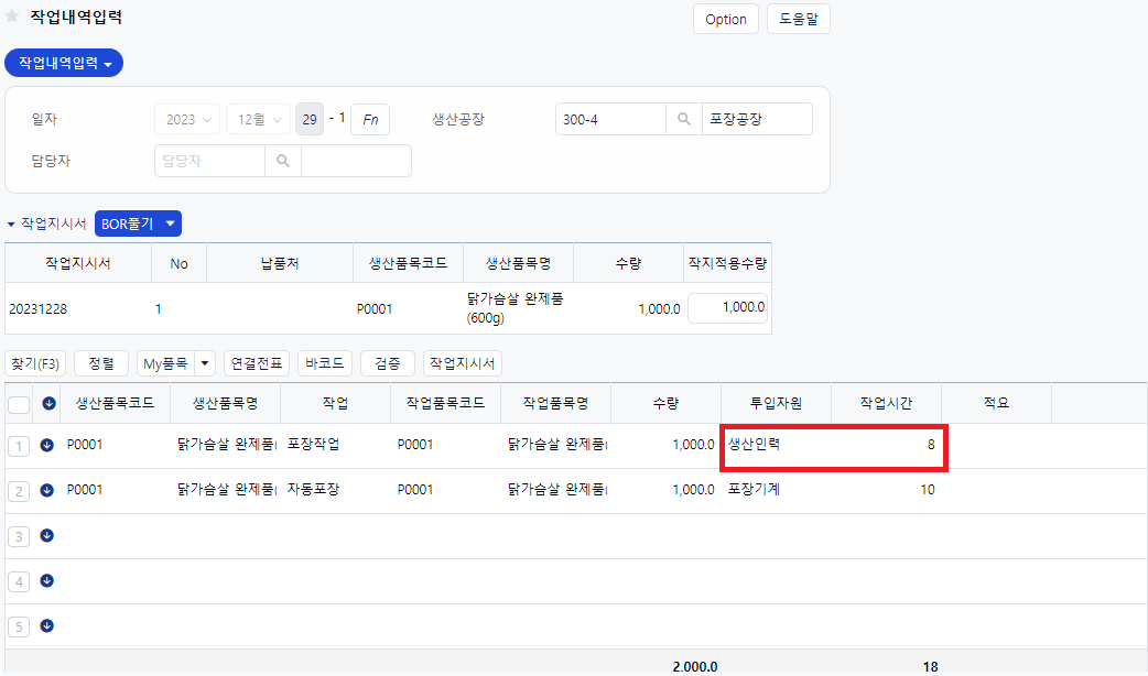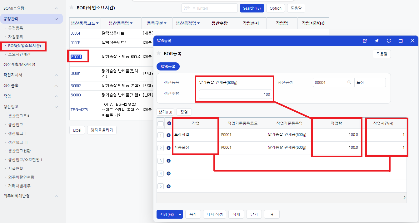 아래 예시는, 닭가슴살 완제품 100개를 생산하기 위하여 '포장작업'이 한 시간, '자동포장'작업이 한 시간 걸려서 도합 2시간의 생산시간이 걸린다고 작성한 화면입니다.