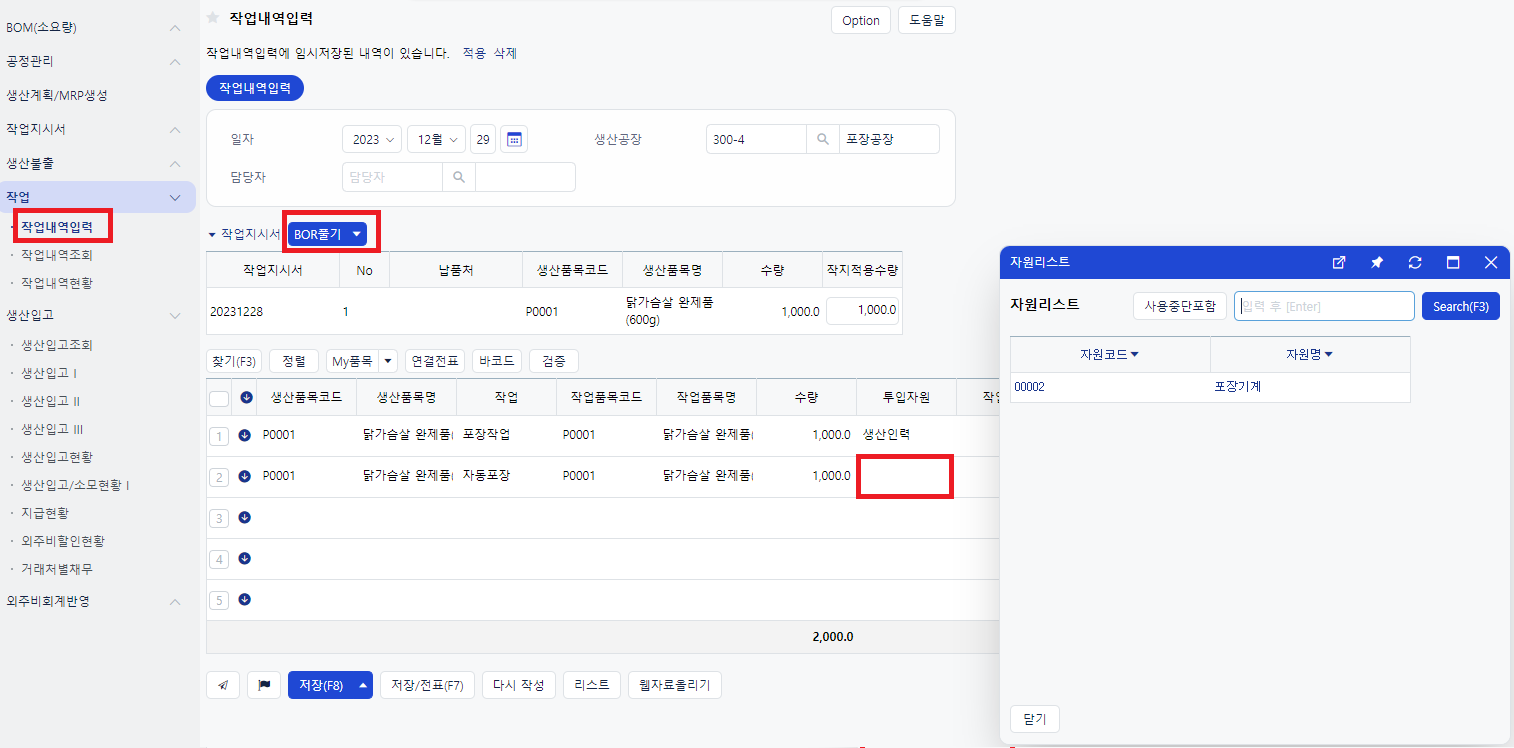그리고 중간에 있는 BOR풀기 버튼을 클릭하면, 해당 완제품을 생산하기 위해 어떤 작업이 얼마의 작업시간이 소요되는지 아래에 나타납니다. 마지막으로 투입자원 필드를 더블클릭하면 자동으로 해당 작업과 연결된 자원리스트 가 나타납니다. 이를 선택하고 저장합니다.