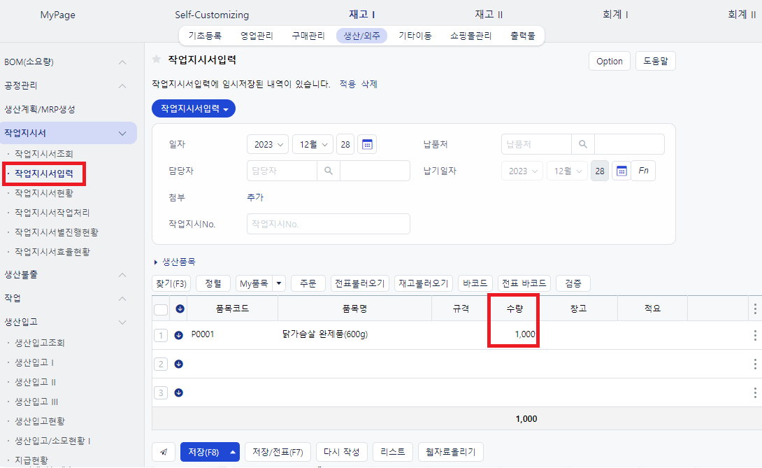 마지막으로 작업내역입력에 대해 알아보겠습니다. 작업내역을 직접 작성하는 방법도 있지만 일반적으로 제조업에서 작업지시서 를 작성하므로, 먼저 작업지시서 작성을 해서 해당 지시서를 끌거와서 작업을 입력해보겠습니다. 먼저 작업지시서 등록입니다.