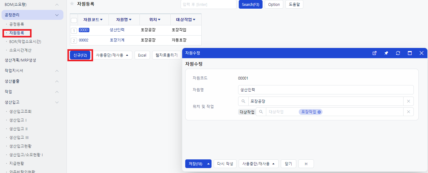 위 경로에서 신규 클릭시 아래와 같은 팝업이 열립니다. 위에서 등록한 작업 은 추상적인 개념이며, 여기서 등록하는 자원 은 실제 해당 작업을 수행하기 위한 인력, 기계 등의 자원을 입력하는 것입니다. 따라서 아래와 같이 자원명에 '생산인력'이라는 구체적인 자원명을 적고, 위치 및 작업에는 '포장공장'을 선택, 그리고 대상작업 위에서 미리 등록한 '포장작업'을 선택하고 저장하였습니다.