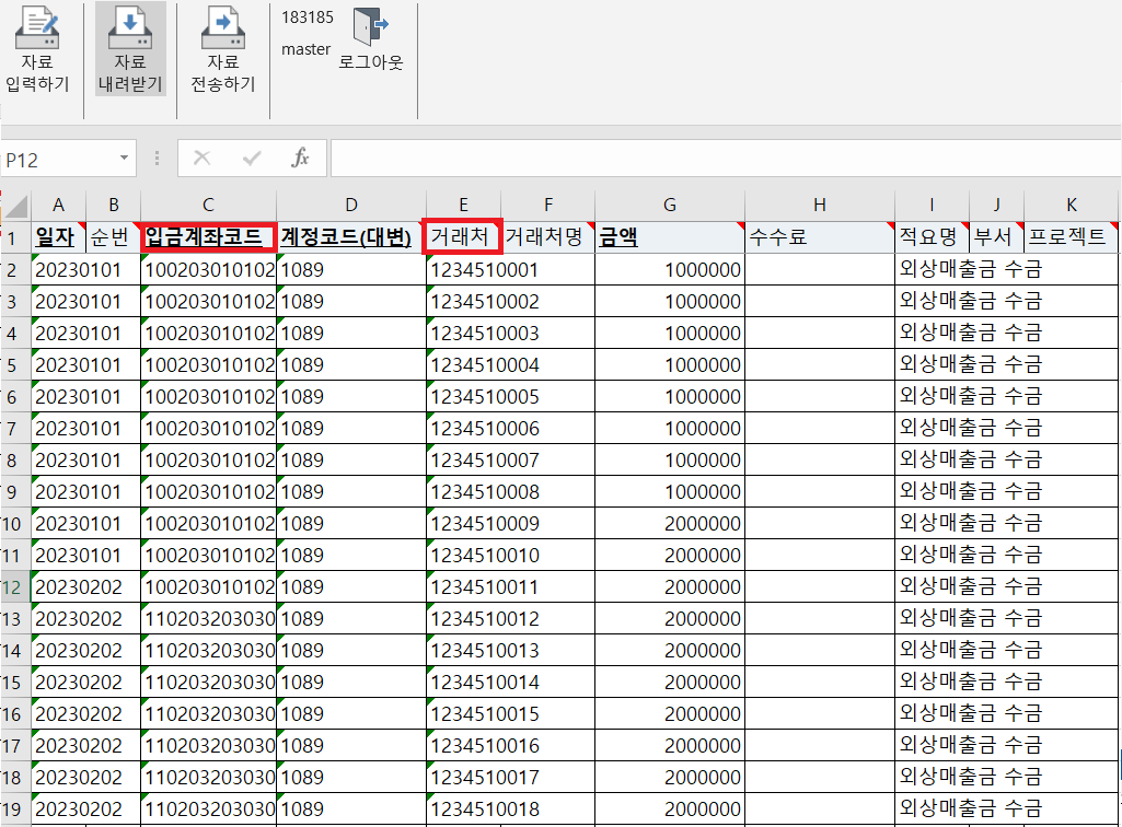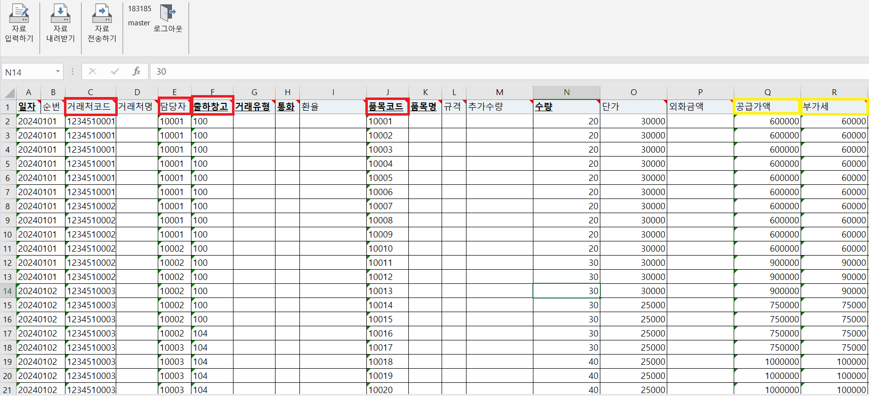 판매자료는 거래내역 데이터인데, 이 자료를 올리기 위해서는 위에서 미리 업로드했던 기초코드 등록이 선행되어야합니다. 아래 예시에서 빨갛게 표시한 항목들은 사전에 미리 이카운트프로그램에 업로드 되어있어야하는 기초코드입니다.