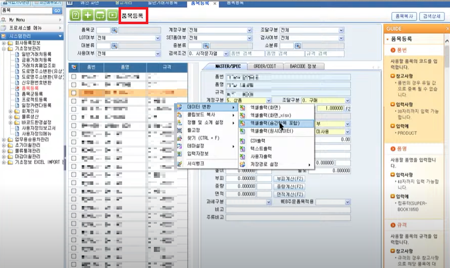 두 번째는 더존의 품목자료를 엑셀로 변환하는 작업입니다. 품목등록 메뉴 - 마우스 우클릭 - 데이터 변환 - 엑셀출력(화면) 을 클릭 시 더존에 등록된 품목데이터베이스를 엑셀로 내려받을 수 있습니다.