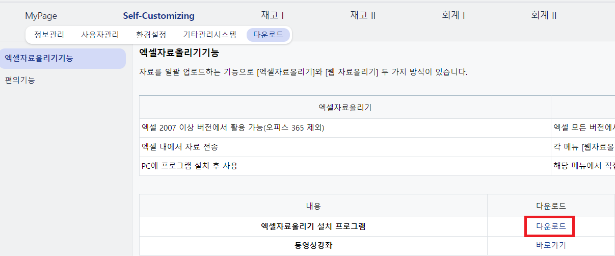 경로 : Self-Customizing - 다운로드 - 엑셀자료올리기기능 - 엑셀자료올리기 설치 프로그램 - 다운로드 클릭 하여 설치