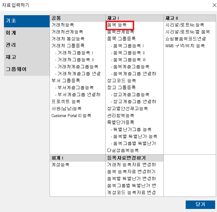 이번엔 중요한 품목등록입니다. 엑셀자료올리기기능 - 자료입력하기 - 기초 - 품목등록 클릭하여 이카운트프로그램 서식을 엽니다.
