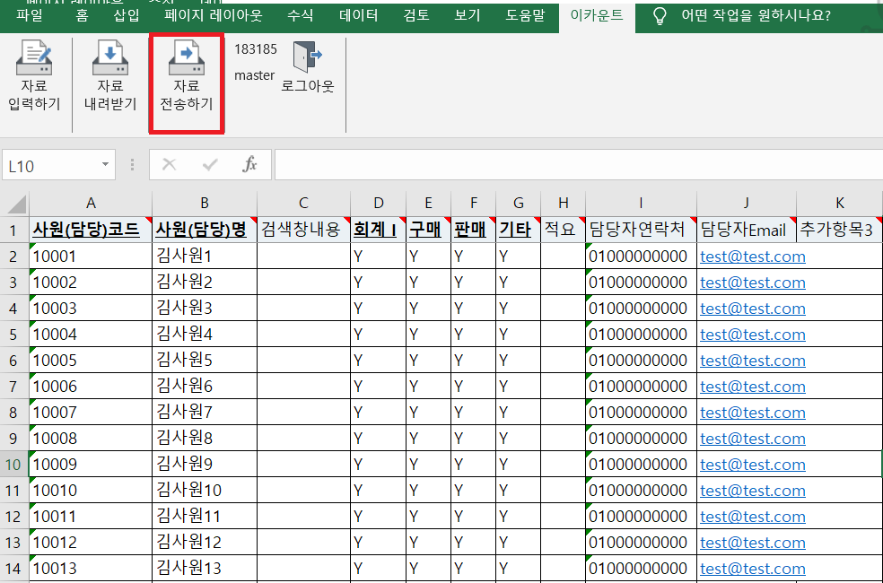아래와 같이 사원(담당)등록 서식에 각 항목에 맞게 더존에서 내려받은 엑셀자료를 정제하여 입력합니다. 입력이 완료되면 자료전송하기 클릭하여 그대로 이카운트프로그램에 업로드합니다.