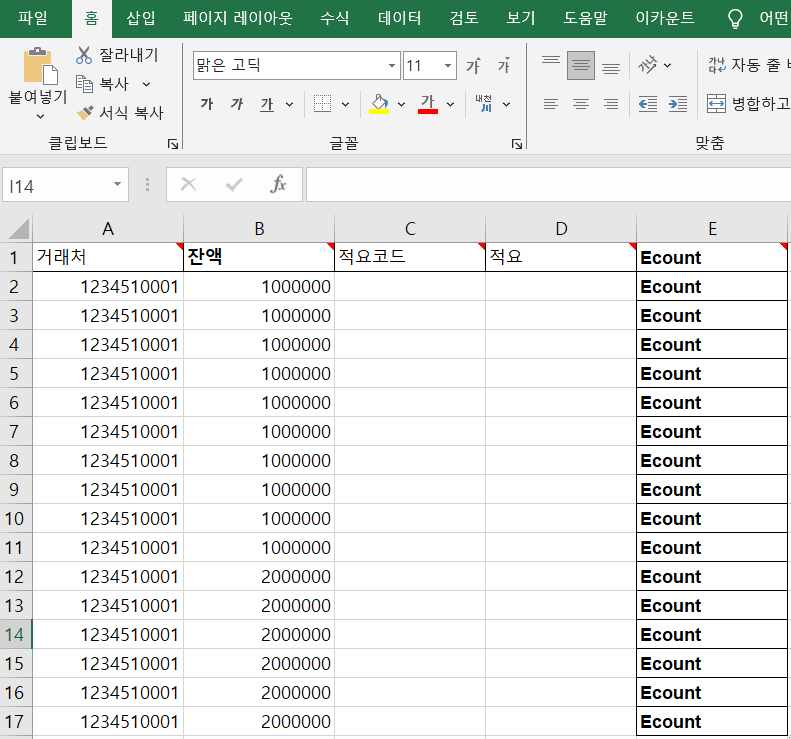 엑셀 서식에 더존프로그램에서 내려받은 채권잔액 자료를 항목에 맞게 입력합니다. 아래 예시를 보면 거래처 항목은 미리 이카운트프로그램에 업로드 되어있어야하는 기초코드입니다. 거래처, 잔액 항목에 붙여넣기 하고 마지막 Ecount 열의 값은 모두 Ecount 라고 복사하여 입력해둡니다.