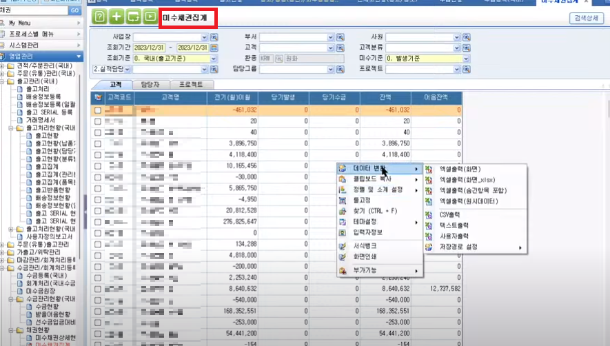 더존 채권잔액 또한 엑셀로 내려받습니다. 이카운트프로그램에 특정 시점 기준으로 외상매출금 잔액을 전부 한 번에 업로드해야 현재 기준으로 잔액이 맞아떨어지게 됩니다. 아래는 더존 아이큐브 - 미수채권집계 - 마우스 우클릭 - 데이터변환 - 엑셀출력(화면) 클릭하여 거래처별 미수채권을 엑셀로 변환하는 예시입니다.