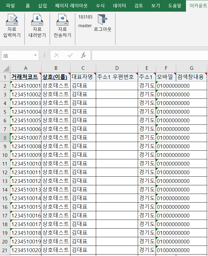 아래는 더존 프로그램에서 내려받아진 거래처자료입니다. 만약 거래처코드 를 더존에 있던것 그대로를 가져가 쓰려면 이 데이터 그대로 이카운트프로그램에 올리면 됩니다. 만약 거래처코드를 사업자등록번호로 넣고싶다면 엑셀에서 미리 데이터를 가공하는 작업이 필요합니다.