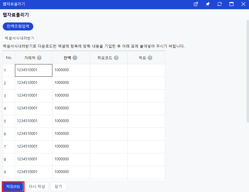 경로 : 이카운트프로그램 로그인 - 회계Ⅰ- FastEntry - 잔액조정입력 - 계정 : 1089 외상매출금 기입 후 검색 - 조정(거래처별) 클릭 - 웹자료올리기 - 엑셀 서식내려받기 클릭